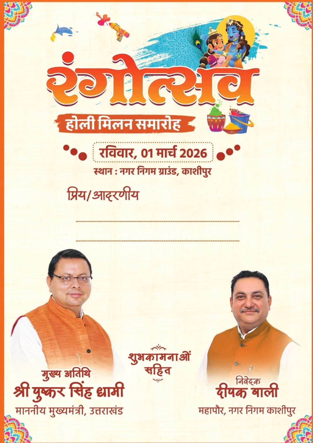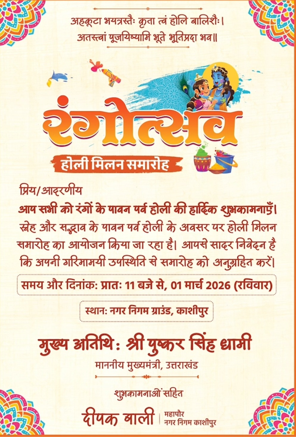 रंगोत्सव कार्यक्रम स्थल पर मीडिया से वार्ता करते हुए महापौर श्री बाली ने इस कार्यक्रम की विस्तृत जानकारी देते हुए बताया कि रंगोत्सव कार्यक्रम प्रातः 11 बजे आरंभ होगा, जिसमें उत्तराखंड की लोक-संस्कृति को आगे बढ़ाते आ रहे लोक गायक इंद्र आर्या, गोविंद दिगारी, खुशी जोशी, पूर्वांचल के गायक आलोक कुमार के अतिरिक्त फूलों की होली के लिए विख्यात ब्रज के रास कलाकार प्रदेश के मुख्यमंत्री पुष्कर सिंह धामी की गरिमामय उपस्थिति में सुन्दर व मनोहारी प्रस्तुति देंगे। महापौर श्री बाली ने मीडिया के माध्यम से आमजनमानस से आग्रह किया है कि अधिक से अधिक संख्या में नगर निगम प्रांगण में पहुंचकर रंगोत्सव कार्यक्रम को ऐतिहासिक यादगार बनाने में अपनी महती भूमिका निभायें। उल्लेखनीय है कि निजी तौर पर आयोजित इस कार्यक्रम की तैयारियां कई दिनों से की जा रही हैं। यह पहला अवसर है कि किसी मुख्यमंत्री के द्वारा काशीपुर की जनता के साथ होली खेली जाएगी। इससे उत्साहित काशीपुर की जनता कल के दिन का बेसब्री से इंतजार कर रही है।